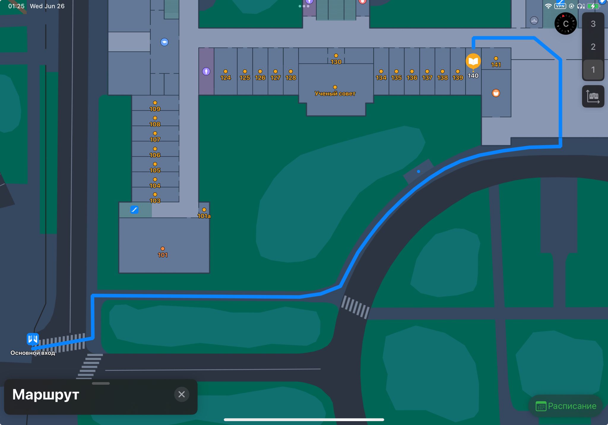 Создавайте маршруты от входа в кампус до нужного кабинета, учитывая множество факторов, включая тип покрытия и доступность территорий.